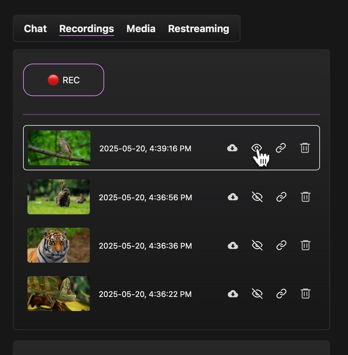 Click the eyeball button next to a recording to make it available to clients who are logged into this channel - you can also download or delete the recording. The public link ๐ for a recording acts as a direct download link when the recording is shared.