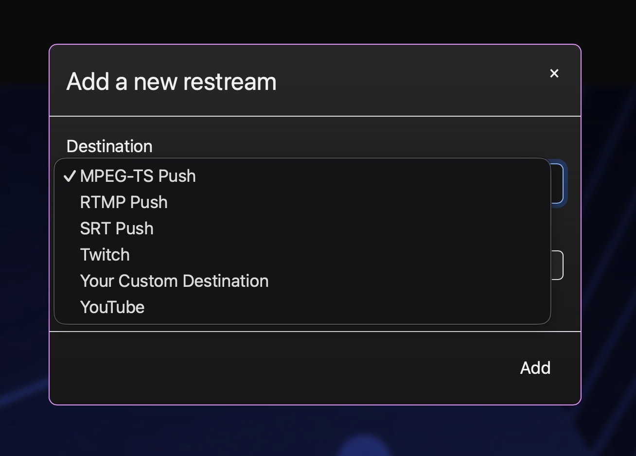 In the restream destinations list you will see all of the destinations defined in the back-end plus options for one-off RTMP Push, SRT Push and MPEG-TS Push: