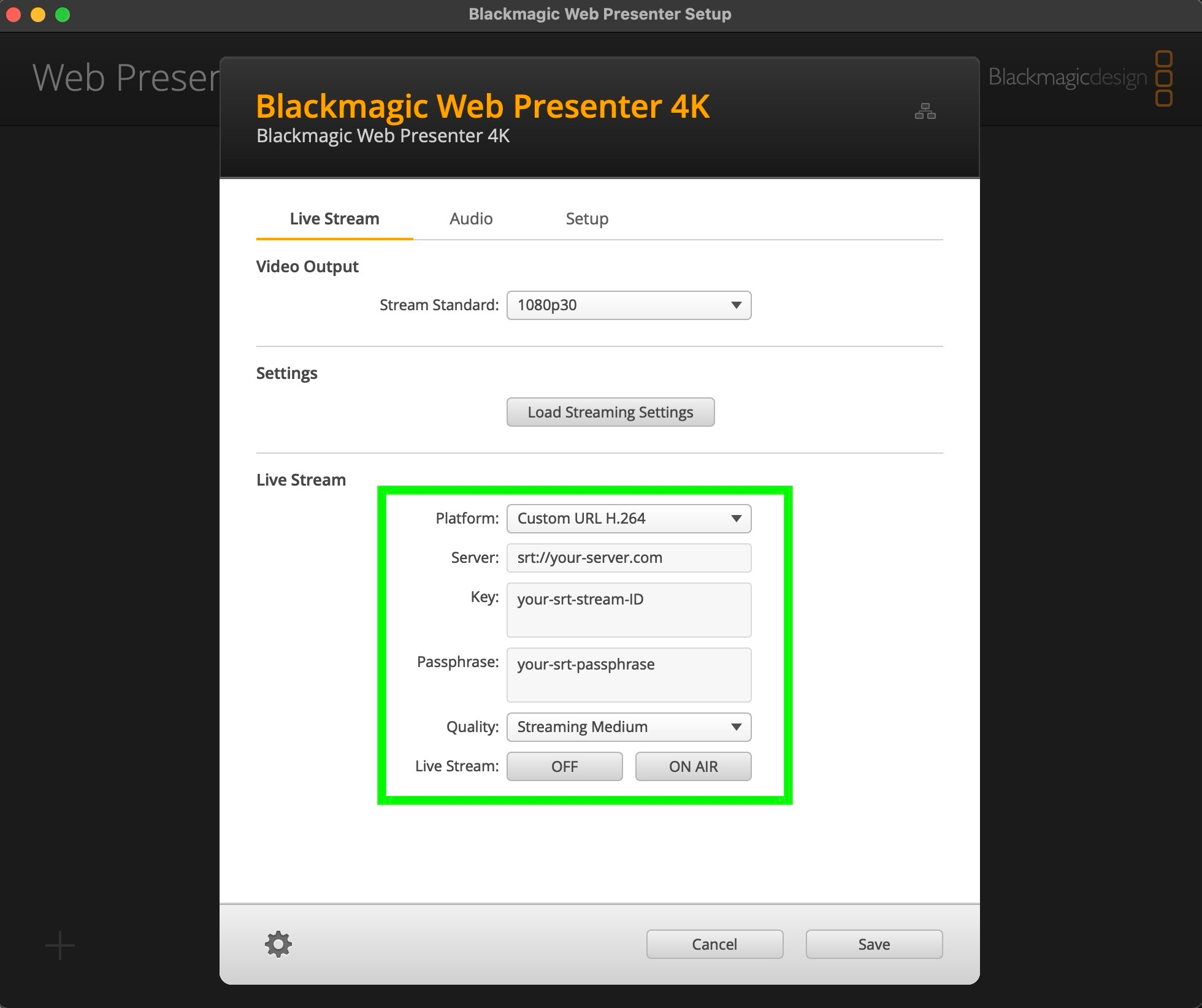 The Blackmagic Web Presenter has a very similar setup. In the Web Presenter Setup application, set the Platform to 'Custom URL H.264' or 'Custom URL H.265' depending on your needs (latency vs quality). Enter the following values (these can be copy/pasted by clicking "show" next to the Stream Source links)